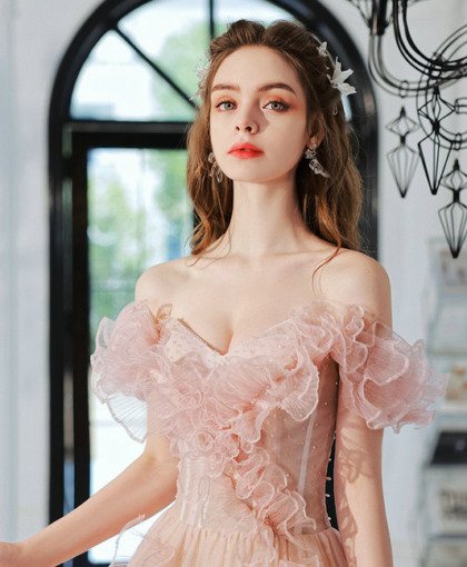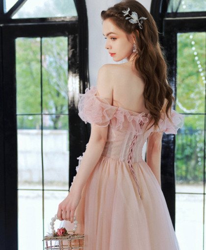 Baby pink prom dress off the shoulder princess ball gown floor length lace up formal quinceanera dress with flowers.