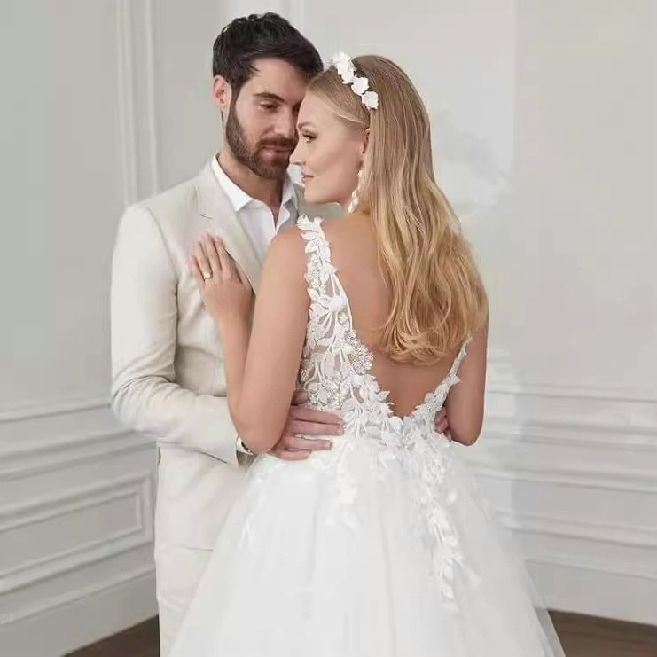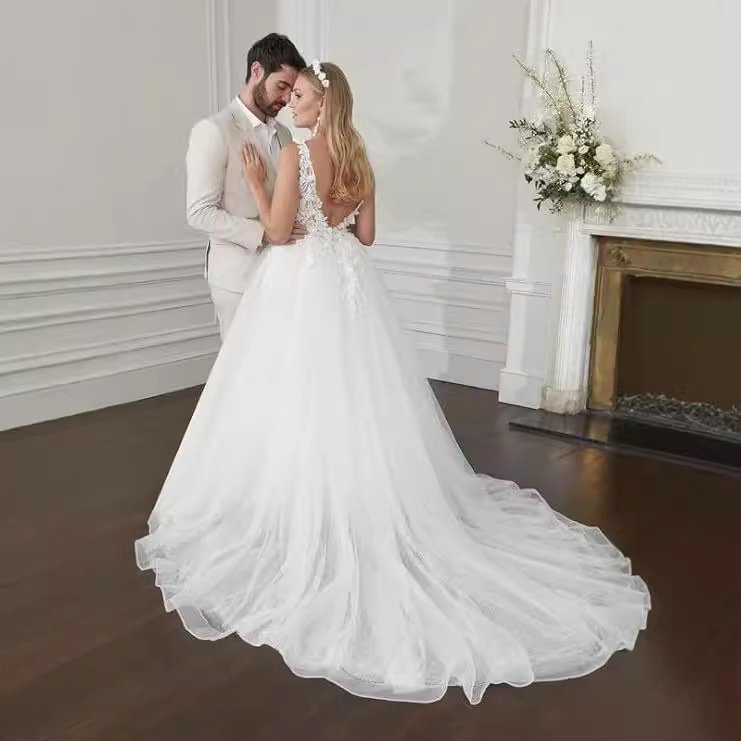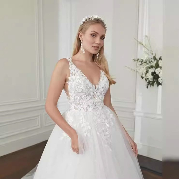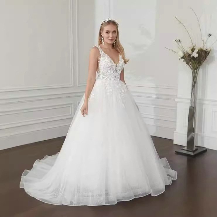 Backless ball gown wedding dress spaghetti strap v neck lace applique bridal dress with train two colors available