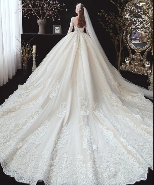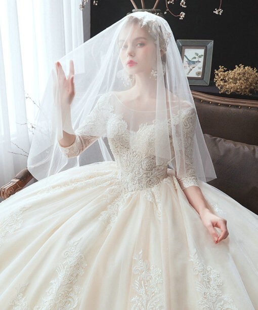 Ball gown wedding dress with sleeves round collar 3/4 sleeves three quarter lace princess bridal gown wholesale.