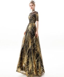 Black and gold prom dress round collar a line floor length long paillette lace bling affordable bridesmaid dress wedding guest dress for sale