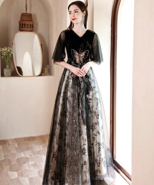 Black lace prom dress v neck a line 1/2 sleeve floor length lace up long affordable formal dress wholesale online