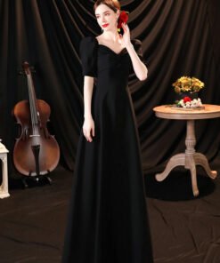 Black satin dress affordable sweetheart short sleeve a line floor length zipper back formal prom dress evening dress for sale