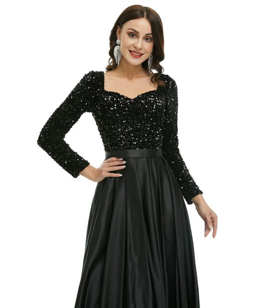 Black sequins prom dress sweetheart a line long sleeve sash zipper back floor length formal evening dress 2022