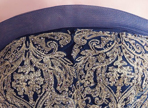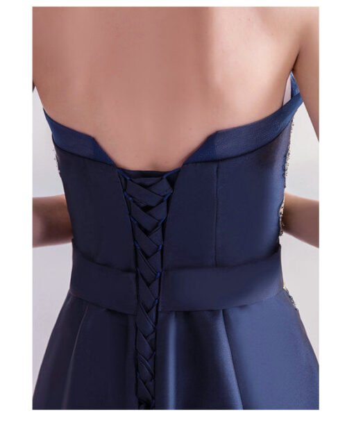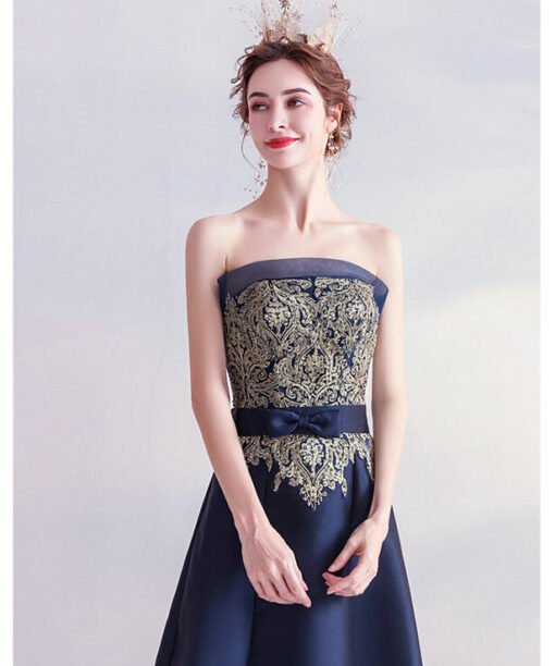 Blue and gold prom dress strapless a line satin and lace long floor length sleeveless formal evening dress wedding guest dress