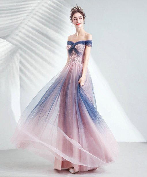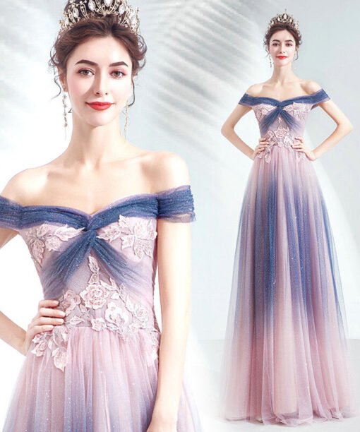 Blue and pink prom dress off the shoulder a line long floor length affordable bling sparkly formal evening dress wholesale online