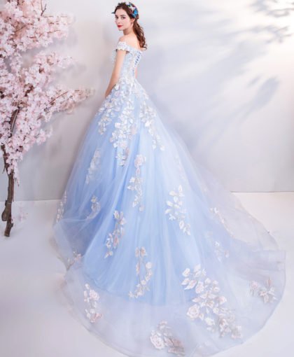 Blue Ball Gown Prom Dress Princess Off The Shoulder With Train