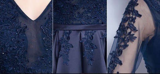 V-neck a line dark blue cocktail dress. Lace Paillette middle length sleeves knee length cocktail dress w sleeves