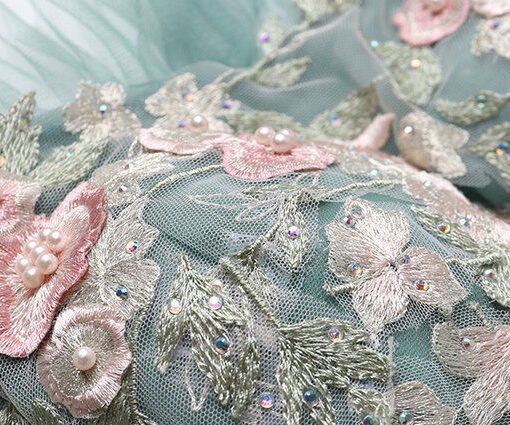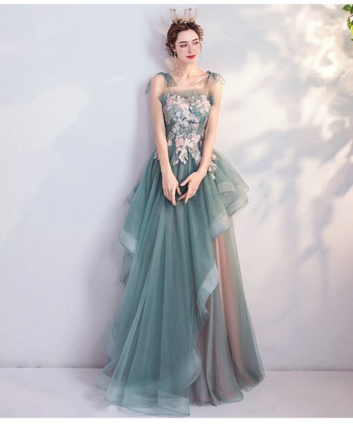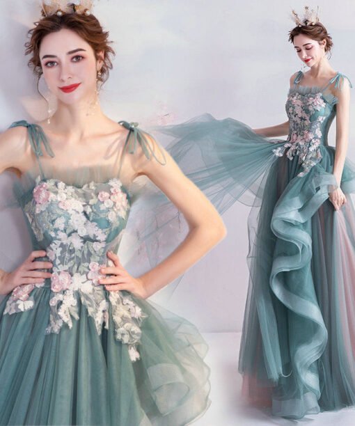 Blue green prom dress strap a line floor length long embroidery colorful flowers sleeveless lace up open back evening dress 2020 new arrival