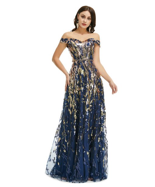 Blue sequin prom dress off the shoulder a line floor length gold paillette zipper back formal wedding guest dress for sale.