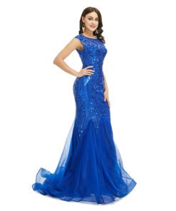 Blue sequins prom dress off the shoulder cap sleeve mermaid formal evneing dress with train 2022 wholesale.