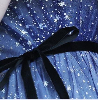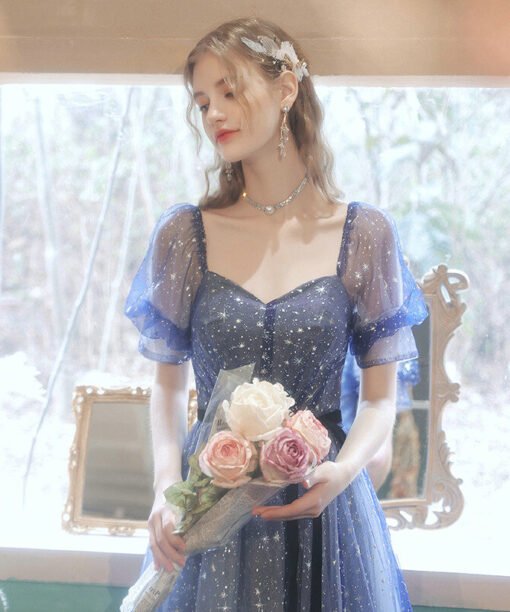 Blue Sparkly Formal Dress Puffy Short Sleeves Star Prom Dress