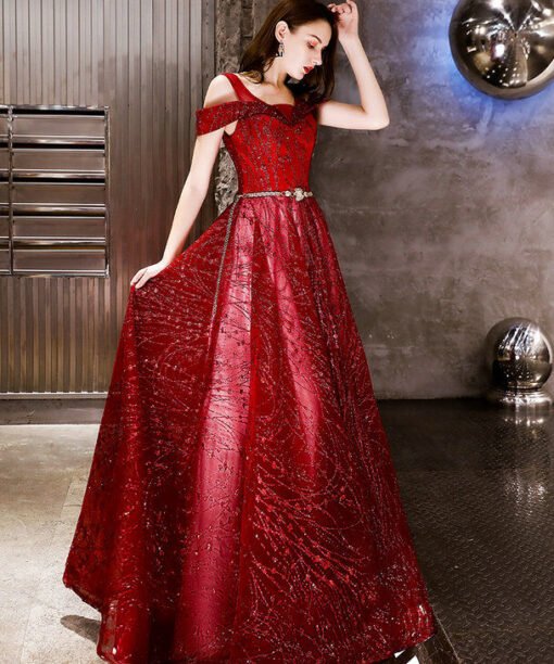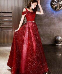 Off the shoulder a line floor length long sparkly floor length affordable burgundy bridesmaid Dress lace up open back formal dress for sale