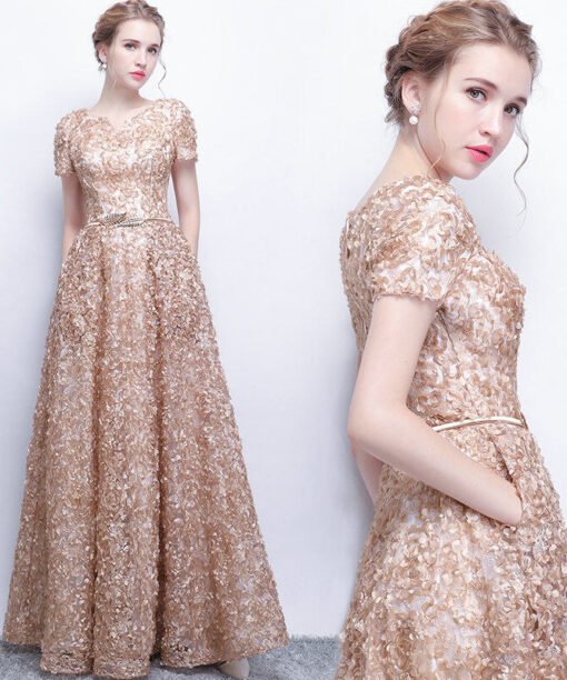 Round collar a line short sleeve long floor length zipper back affordable champagne formal dress with waistband for sale