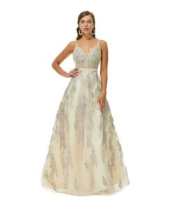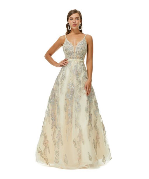 Champagne wedding guest dress strap a line sleeveless beaded lace zipper back floor length formal prom dress wholesale.