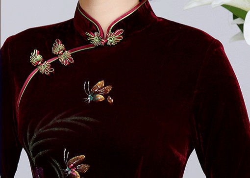 Chinese Qipao with bracelet sleeves for women, Printing and Embroidery peony flower. High quality pleuche fabric. two colours available in stock.