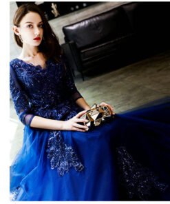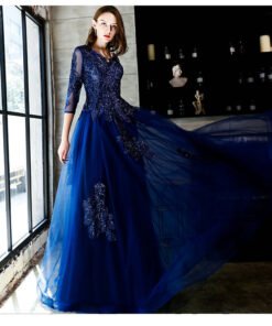 Dark blue formal dress v neck a line floor length long lace affordable prom dress lace up with sleeves affordable wedding guest dress wholesale