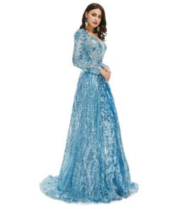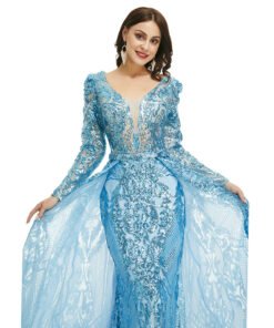 Detachable train prom dress v neck mermaid a line long sleeve sequin blue formal wedding guest dress wholesale online.