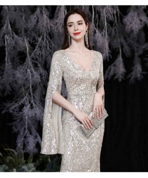 Evening gowns with cape v neck mermaid long sleeve sexy silver bling formal evening dress prom dress for sale.
