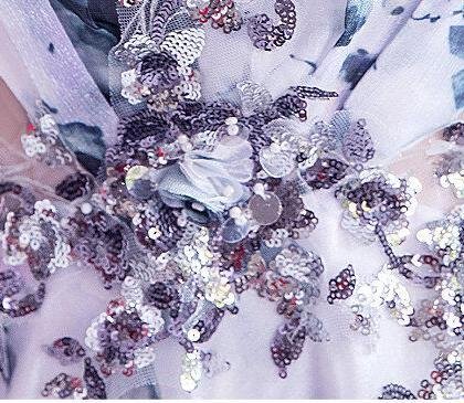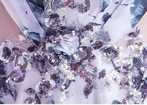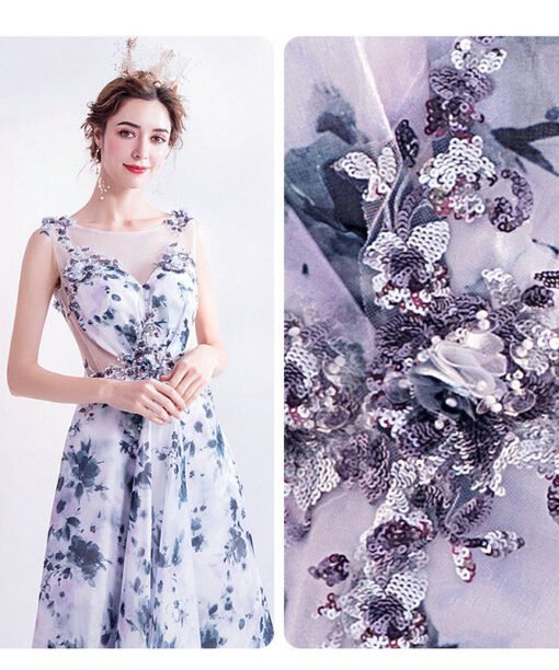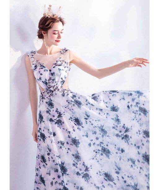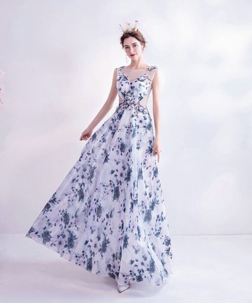 Floral print dress round collar a line floor length long bead white and grey open back formal evening dress wholesale online 2020 new arrival