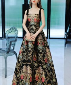 Floral print evening gowns black spaghetti strap a line long printing flowers lace up floor length prom dress.
