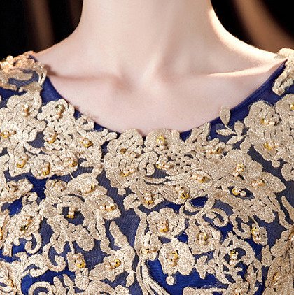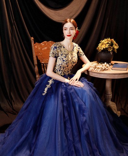 Gold and blue prom dress round collar ball gown gold lace embroidery floor length lace up long formal evening dress wholesale