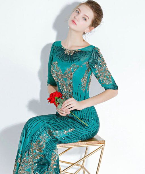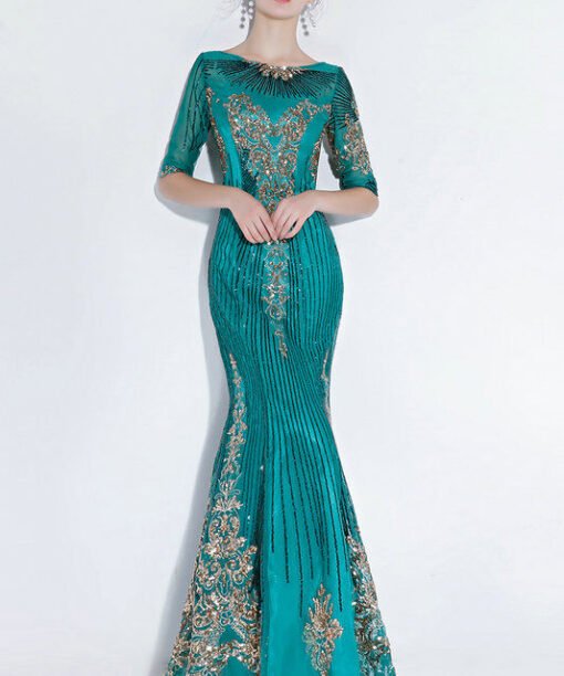 Green mermaid prom dress round collar short sleeve gold paillette lace beaded floor length long bridesmaid dress wholesale