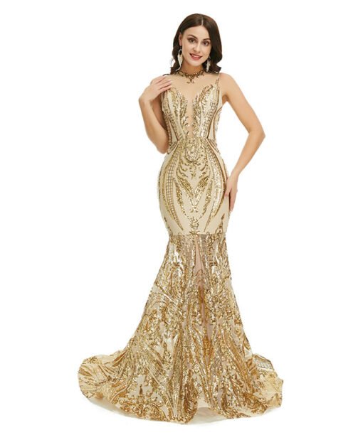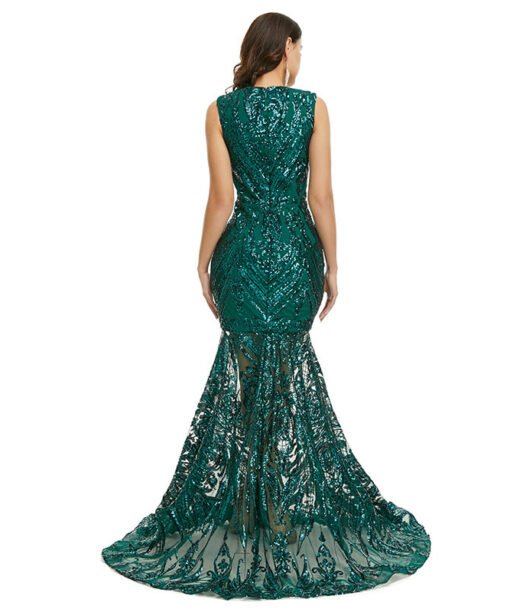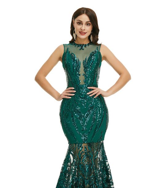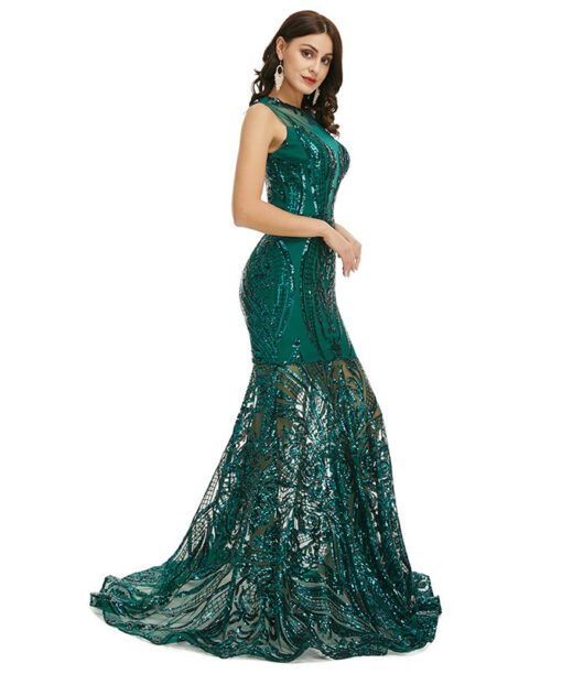 Green mermaid prom dress sleeveless sequins sexy formal dress with train champagne gold black light green silver colors available.