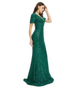 Green sequin prom dress v neck mermaid open back short sleeve bling sexy formal evening dress for sale.