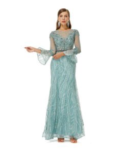 Green wedding guest dress round collor mermaid long sleeve beaded lace formal prom dress wholeale online.