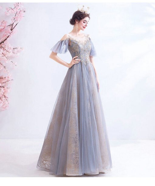 Grey Blue Prom Dress Round Collar Short Sleeves Formal Dress