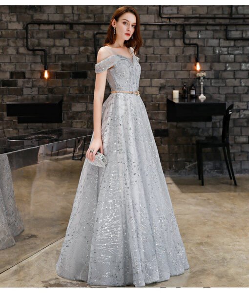 Grey long formal dress off the shoulder a line long floor length sparkly lace affordable bridesmaid dress wholesale online