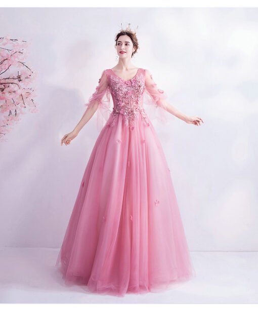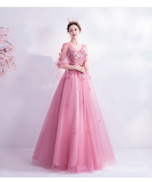 Hot pink prom dress v neck long sleeve ball gown floor length lace up flowers beaded formal gown wholesale.
