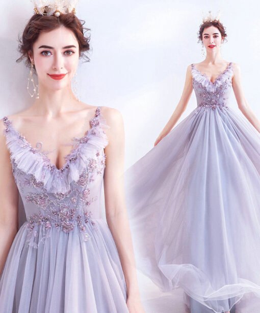 Lavender Prom Dress V Neck A Line Beaded Evening Dress