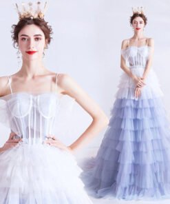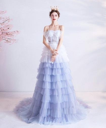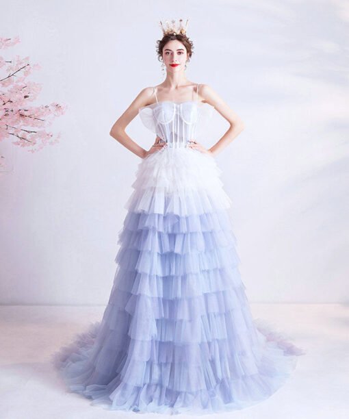 Layered prom dress strap sleeveless ball gown princess affordable blue and white formal quinceanera dress plus size wholesale online 2020