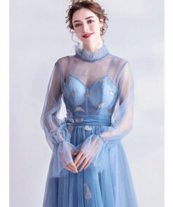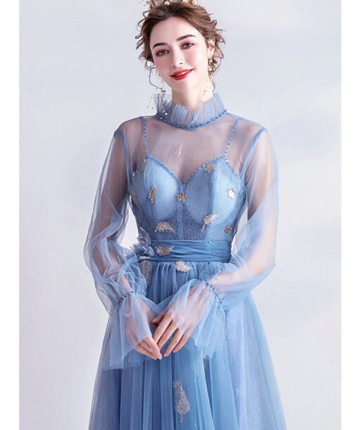 Light Blue Formal Dress High Neck A Line Long Sleeve Prom Dress