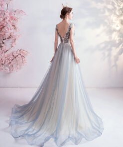 Light blue open back prom dress v neck a line sleeveless beaded flowers long formal party dress with short train wholesale online