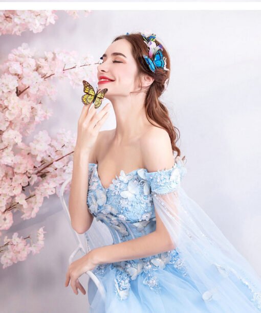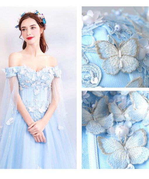 Light blue prom dresses 2022 off the shoulder ball gown lace up floor length beaded lace flowers with cape 2022