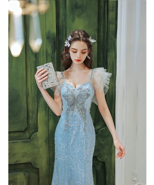 Light blue sequin dress spaghetti strap v neck bling mermaid formal evening dress with train wholesale online