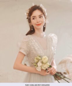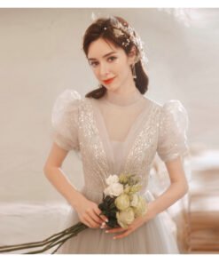 Light grey prom dress high neck a line v neck short puffy sleeve long floor length evening dress formal dress wholesale