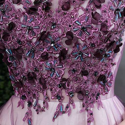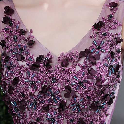 V neck a line long prom dress purple. Sleeveless lace up beading applique prom dress online