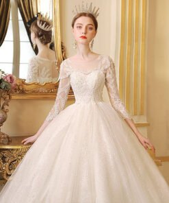Long sleeve ball gown wedding dress round collar white lace beaded haute couture long train bridal gown for winter wholesale