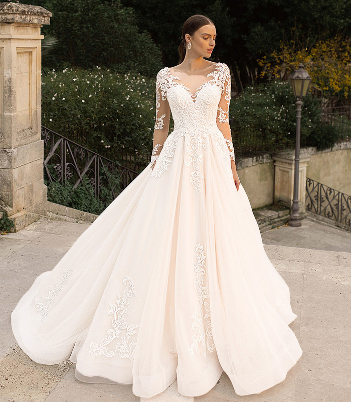 Long sleeve lace wedding dress Illusion neckline a line button back bridal gown with train for sale.