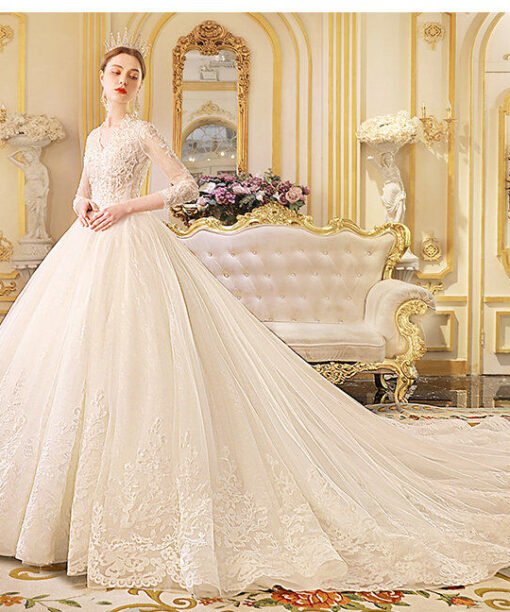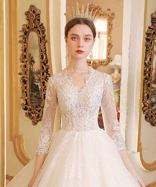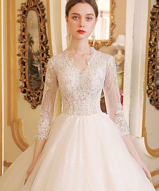 Long sleeve lace wedding dress gorgeous v neck ball gown long train with hand made beaded plus size formal white bridal gown 2020