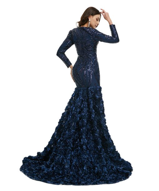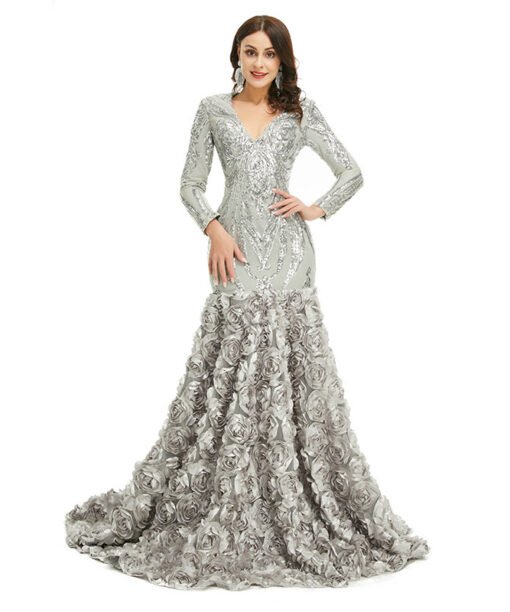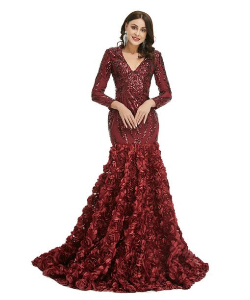 Long sleeve mermaid prom dress v neck sequins flowers formal evening dress with train burgundy pink blue green colors available.