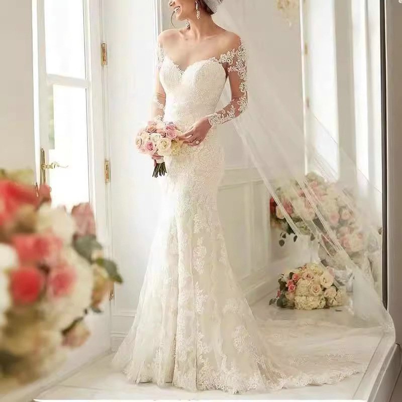 Long sleeve mermaid wedding dress luxury off the shoulder v neck lace applique backless zipper back formal bridal gown for sale.