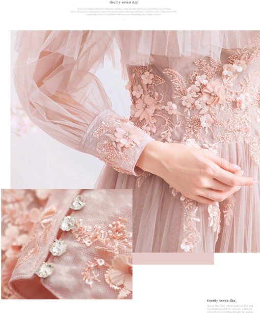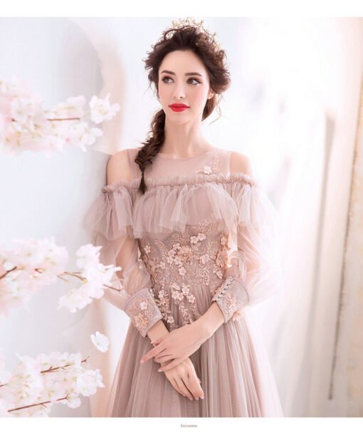 Long sleeve pink gown off the shoulder a line lace flower floor length lace up formal prom dress wholesale for sale.