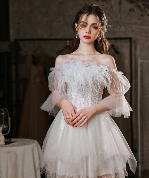 Mesh prom dress off the shoulder a line white lace feather short sleeve floor length formal dress wholesale online.