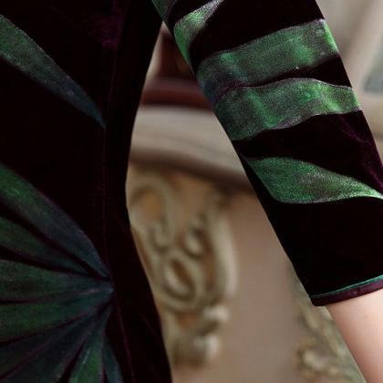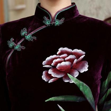 Hot selling Hand Printing Long Modern Qipao for Women, making by high quality pleuche fabric. Two colors in stock. Suitable for being worn in Spring,Autumn and Winter.