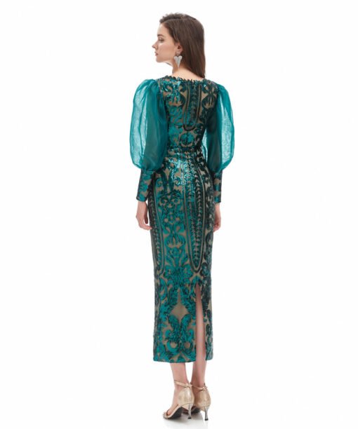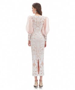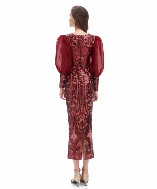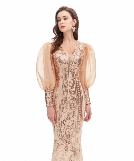 Mother of the bride dresses tea length v neck puff long sleeve pailltte slim zipper back four colors champagne burgundy white and green.