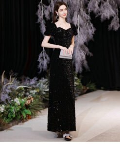 Off the shoulder black evening dress affordable a line sparkly glitter floor length zipper formal prom dress 2021 wholesale online.